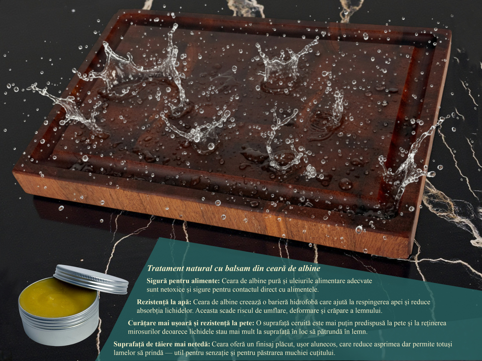 Igiena si Siguranta Alimentara - Lemnul de mahon are proprietati antimicrobiene naturale. Structura end grain ajuta la tragerea bacteriilor in interiorul fibrelor unde, lipsite de oxigen si umiditate la suprafata, acestea mor rapid.