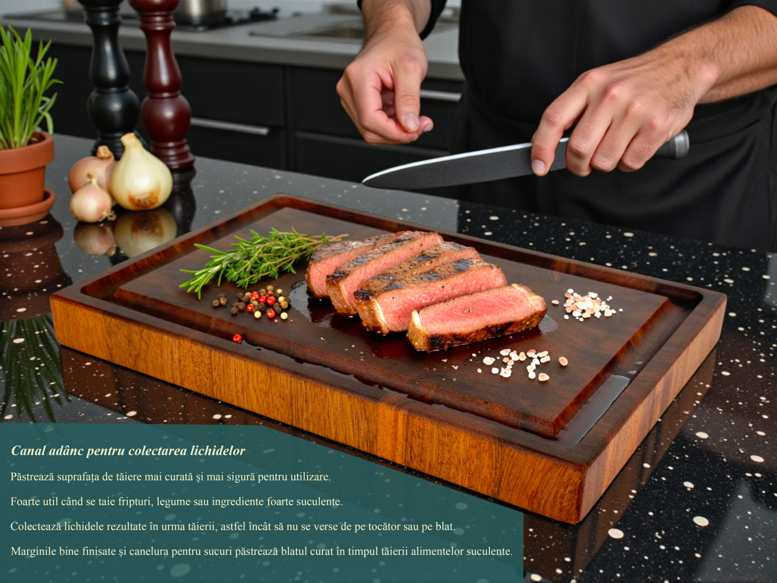 Canelura pentru scurgerea sucului - frezata in jurul perimetrului pe suprafata superioara, aceasta este conceputa pentru a prinde lichidele atunci cand se taie carne sau fructe.