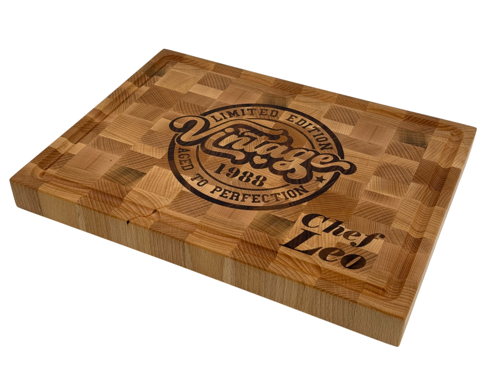 Durabilitate Maximă: Designul este încorporat adânc în lemn, nu se șterge, fiind la fel de rezistent ca restul tocătorului.